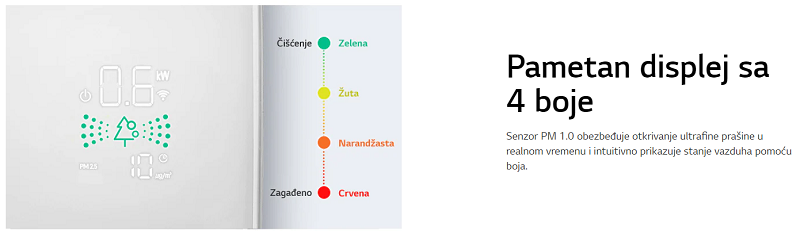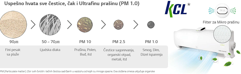 LG klima uređaji su unapređeni pomoću 2-u-1 sistema za prečišćavanje (hlađenje i filtriranje vazduha) kojim mogu da se filtriraju sitne čestice prašine, bacili i zagađivači vazduha – npr. PM 1.0.
